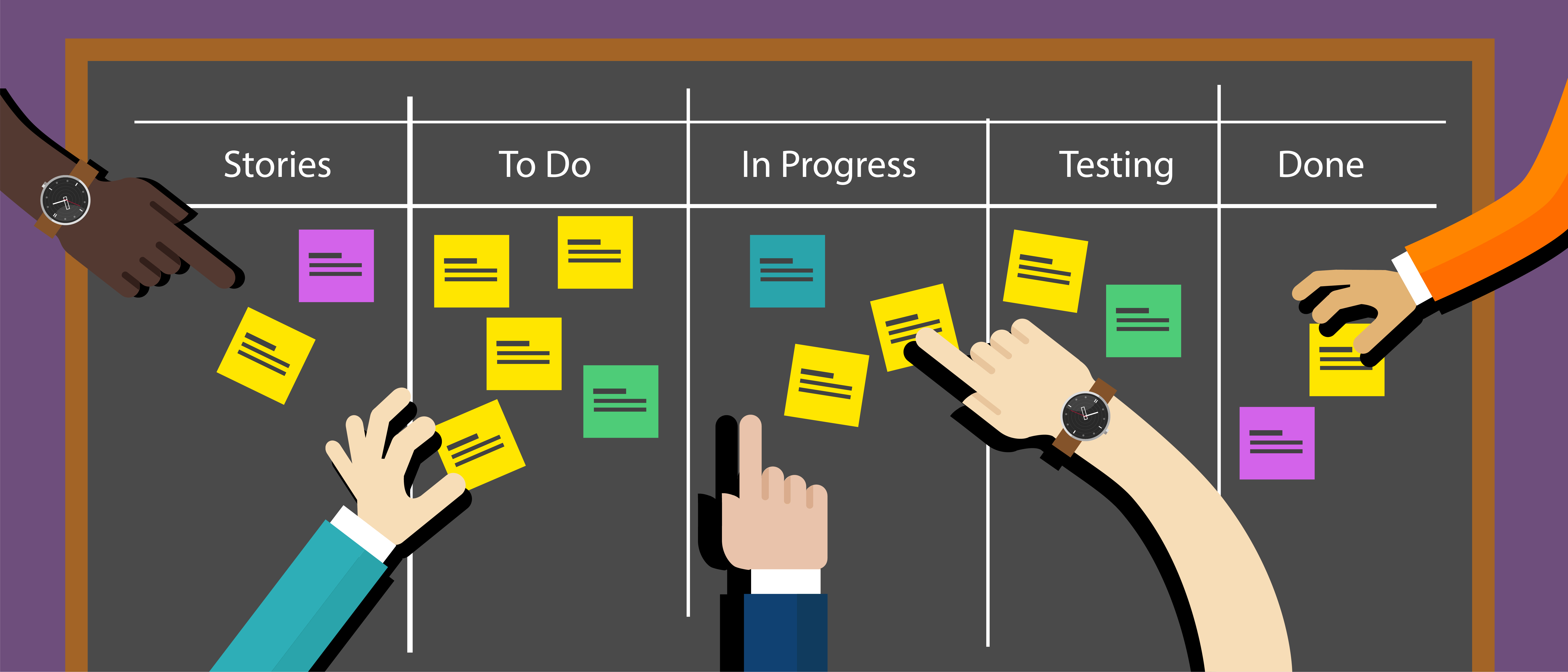 El modelo Agile/Scrum propone dividir un proyecto en varios módulos que deben ser probados y entregados incrementalmente. Los miembros del equipo tienen acceso a un tablero similar al que se observa a continuación, en donde colocan las tareas o actividades relacionadas con el proyecto debajo de la columna correspondiente.